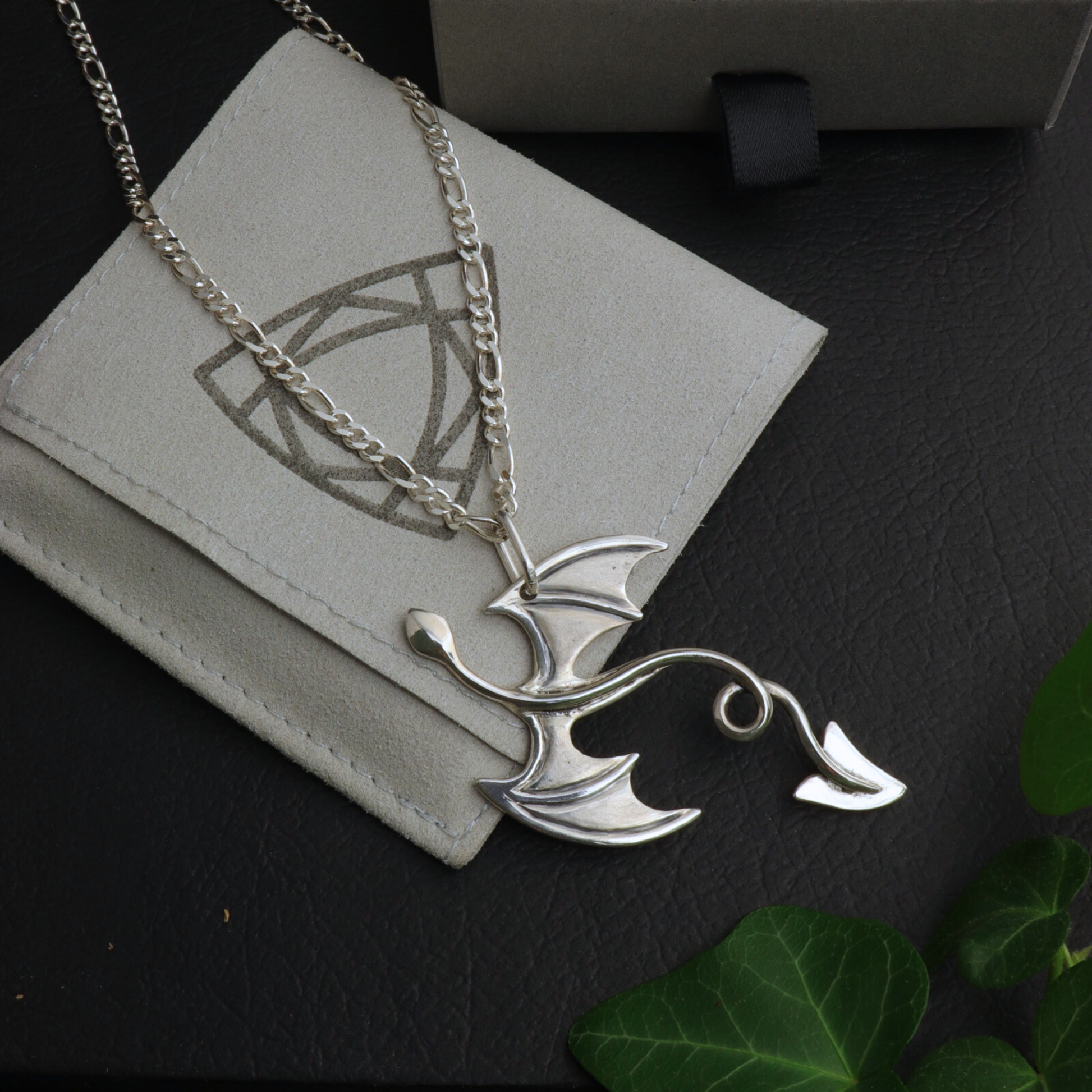 A large silver dragon takes flight, its carved wings spread wide as a coiling tail trails behind; a fearsome friend and faithful guardian, ready to journey wherever your adventures may take you.